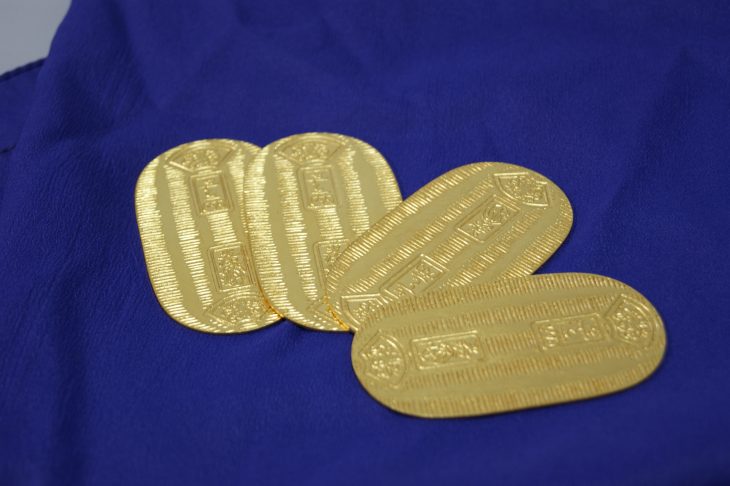 日本の古銭は穴銭のイメージが強いですが、一方で大判や小判、金貨など、金を使ったお金も流通してきました。製錬技術が発達して戦国武将や商人たちが金を扱うようになった16世紀では、豊臣秀吉が作らせた天正沢瀉(おもだか)大判が有名です。
