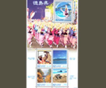 2015年(平成27)年に「地方自治法施行60周年記念シリーズ」の1つとして発行された記念切手になります。発行枚数は80万シートで、1シートは82円切手5枚で構成されています。各切手には「鳴門の渦潮と阿波おどりとすだちの花」「阿波人形浄瑠璃」「吉野川と眉山」「祖谷のかずら橋」「大浜海岸とうみがめ」、シートの背景には「阿波おどり」がデザインされています。